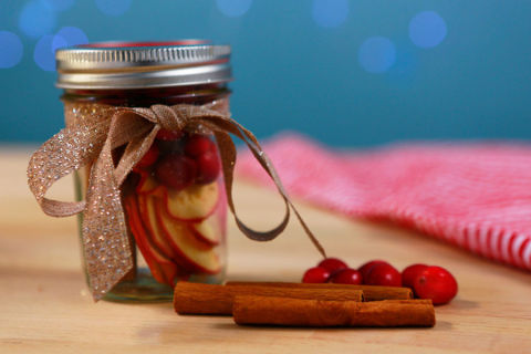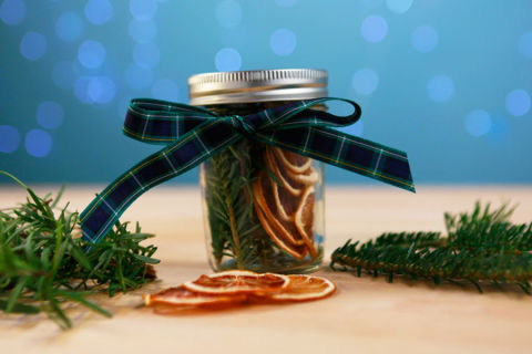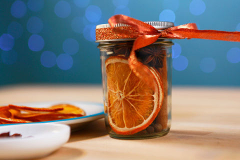 1. Fill the jar with your choice of fragrant ingredients; the amount needed will vary depending on your jar size. Use long-lasting dried fruits if you won't be simmering your mixture right away. We followed this tutorial to dehydrate oranges, lemons and apples in the oven, but you can also find them pre-dried in grocery stores or on Amazon.