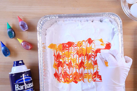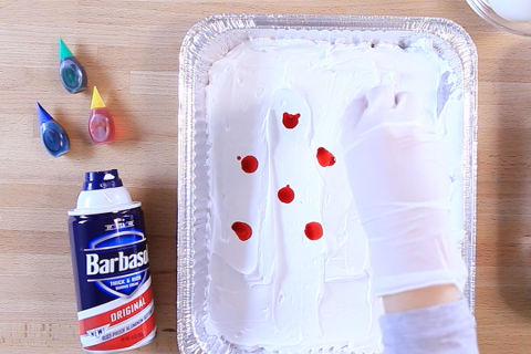 2. Drip food coloring onto the shaving cream. Don't be afraid to be generous with the colors — the more you use, the brighter your eggs will be.